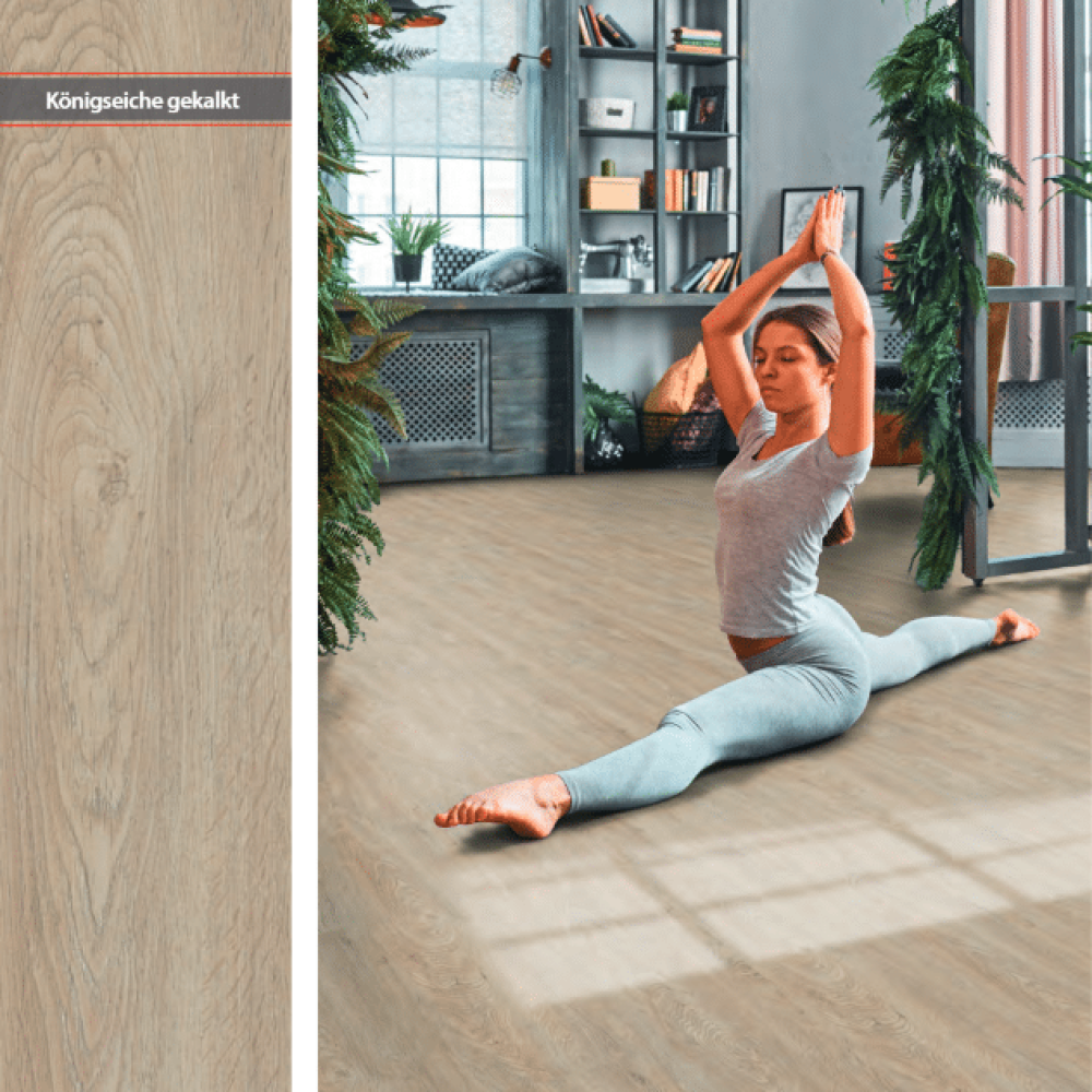 Dank des bewährten Klicksystems lässt sich der Samurai – Königseiche gekalkt – Nautico Silent schnell und einfach verlegen. Die Hydrodur-Trägerplatte mit Trittschalldämmung sorgt zusätzlich für Stabilität und Komfort.